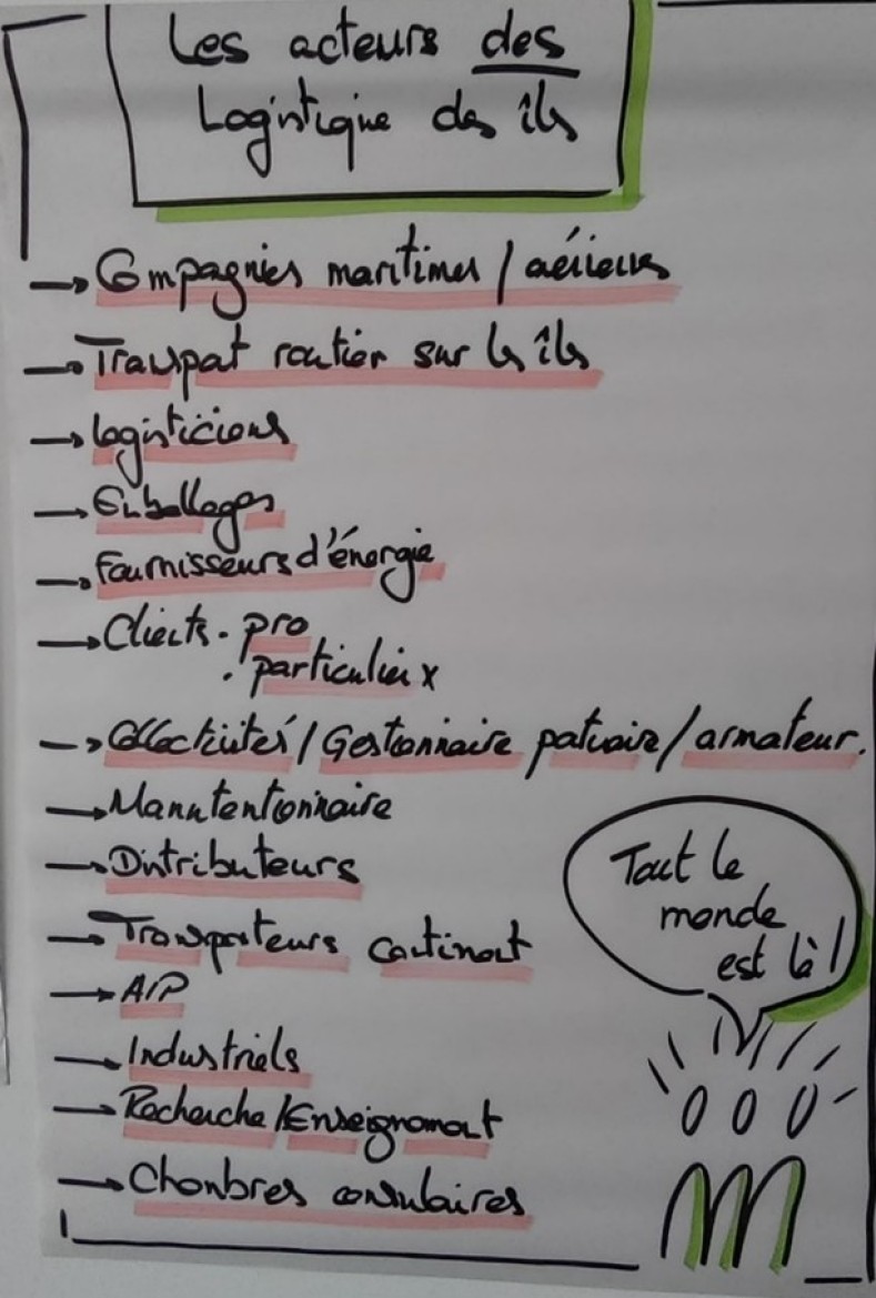 L’atelier a regroupé 40 participants et a permis de valider que l’ensemble des typologies d’acteurs impliqués dans la logistique insulaire était représenté, à l’exception des compagnies aériennes, des manutentionnaires et des clients finaux particuliers.