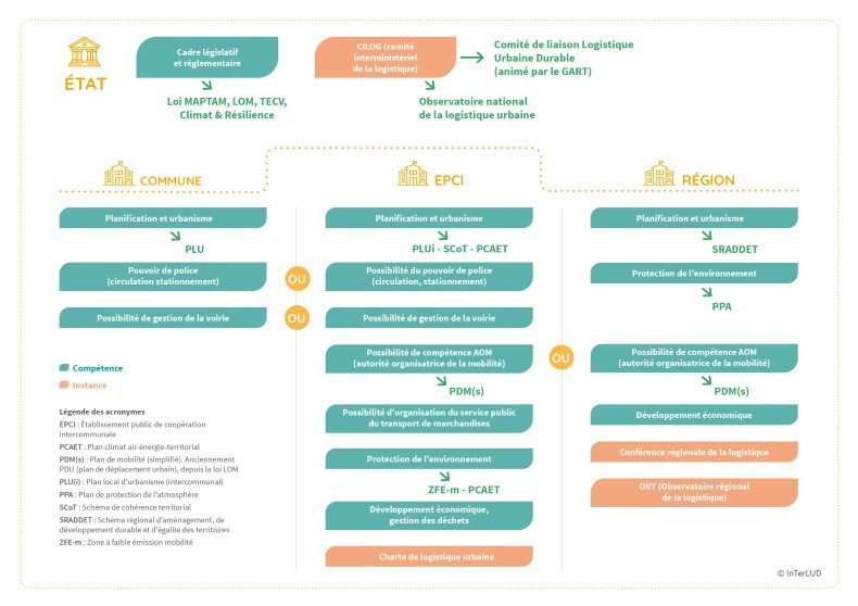 L’État pose le cadre réglementaire et législatif, à travers notamment la promulgation de lois, concernant le transport de marchandises. On retrouve parmi les plus récentes la loi LOM, la loi Climat & Résilience.