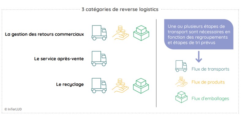 Ce sont les produits renvoyés par les clients (erreurs de commande, défauts, insatisfaction). Avec l’essor du e-commerce, ces flux sont en forte croissance. Leur bonne gestion permet de limiter les pertes et de remettre les produits en vente après contrôle ou reconditionnement, évitant ainsi leur mise au rebut. Cette catégorie de flux concerne aussi la gestion des invendus (stocks excédentaires).