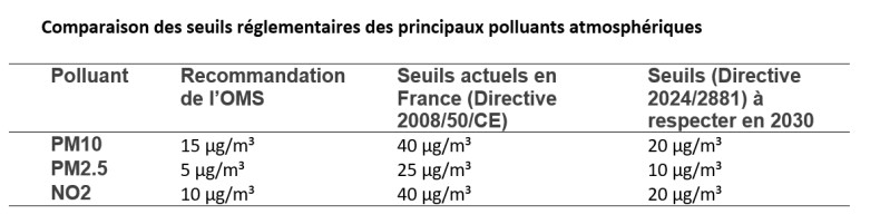 Depuis 2010, les directives européennes fixent des valeurs limites d’émissions de différents polluants problématiques pour la santé, notamment des particules et des oxydes d’azote. En 2021, l'Organisation Mondiale de la Santé (OMS) a révisé ses lignes directrices en abaissant les seuils recommandés pour plusieurs polluants.