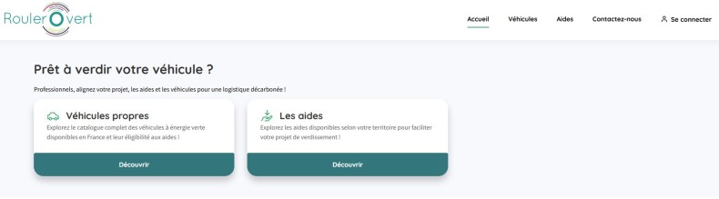 En naviguant sur la plateforme, le catalogue de véhicules propres (https://rouler-o-vert.green/vehicles) est accessible via l’encadré “véhicules propres”.