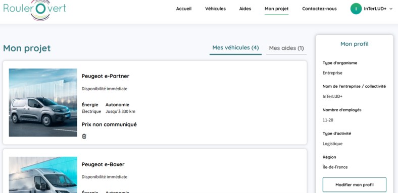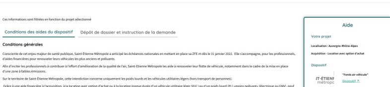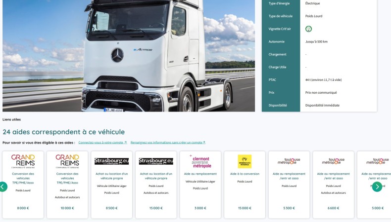Après avoir cliqué sur un des véhicules, les professionnels peuvent également avoir un aperçu des aides qui correspondent à chaque véhicule.